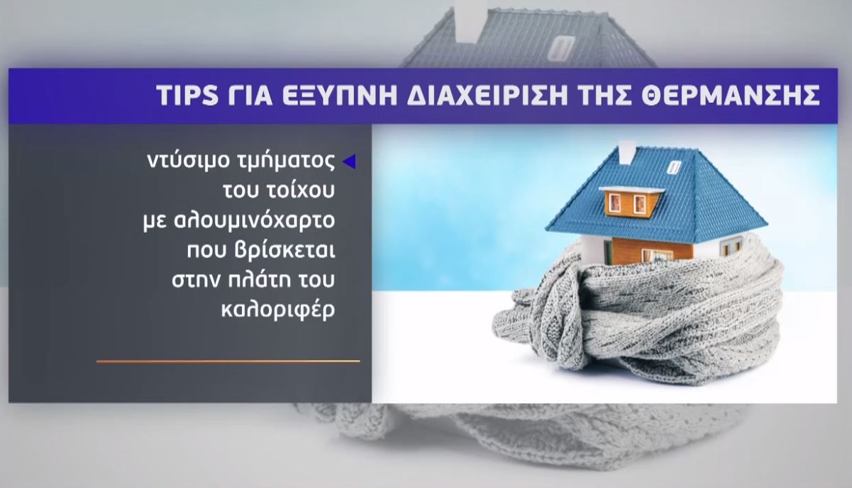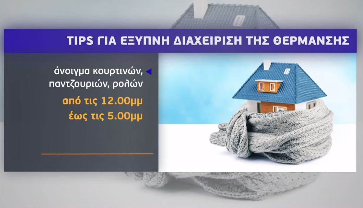 Συμβουλεύοντας, είπε ακόμη: «Ανοίγουμε κουρτίνες, παντζούρια, ρολά σε όλα τα δωμάτια που έχουν νότιο νοτιοδυτικό νοτιοανατολικό προσανατολισμό για να μπαίνει μέσα από τα τζάμια. Ηλιακή ακτινοβολία και να προθερμαίνετε τα εσωτερικά στους εσωτερικούς χώρους των δωματίων, διότι θερμαίνονται τα δάπεδα, οι τοίχοι κλπ. Άρα λοιπόν έχουμε πετύχει μια προθέρμανση. Με αυτό τον τρόπο εκμεταλλευόμαστε παθητικά τη θέρμανση του κτιρίου».